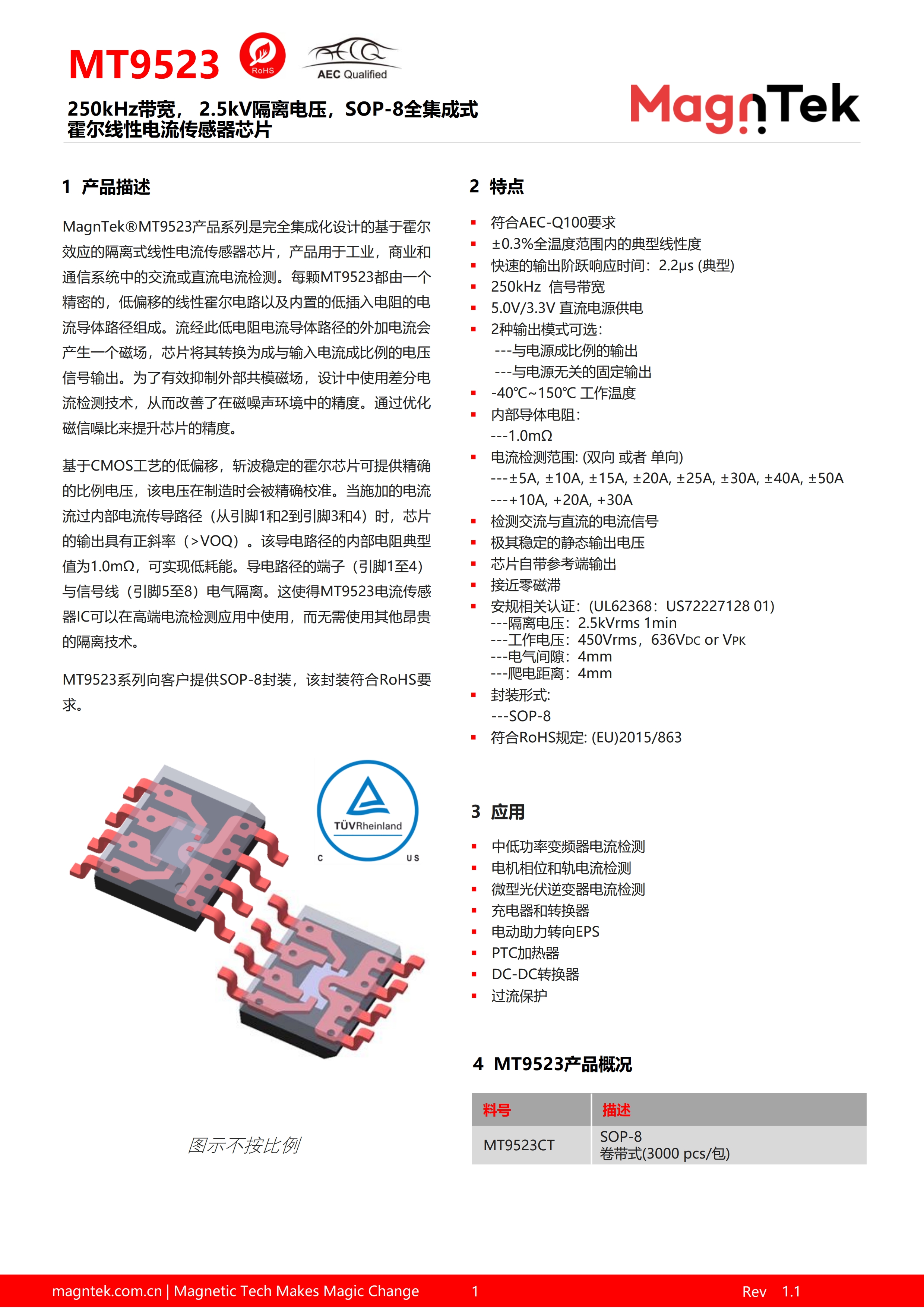 MagnTek@MT9523產品系列是完全集成化設計的基于霍爾效應的隔離式線性電流傳感器芯片,產品用于工業,商業和通信系統中的交流或直流電流檢測。每顆MT9523都由一個精密的,低偏移的線性霍爾電路以及內置的低插入電阻的電流導體路徑組成。250kHz帶寬2.5kV隔離電壓, SOP-8全集成式霍爾線性電流傳感器芯片。